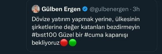 Borsayla yakından ilgilendiği bilinen Gülben Ergen, "Dövize yatırım yapmak yerine ülkesinin şirketlerine değer katanları bezdirmeyin, güzel bir cuma kapanışı bekliyoruz." diyerek yetkililere seslendi.