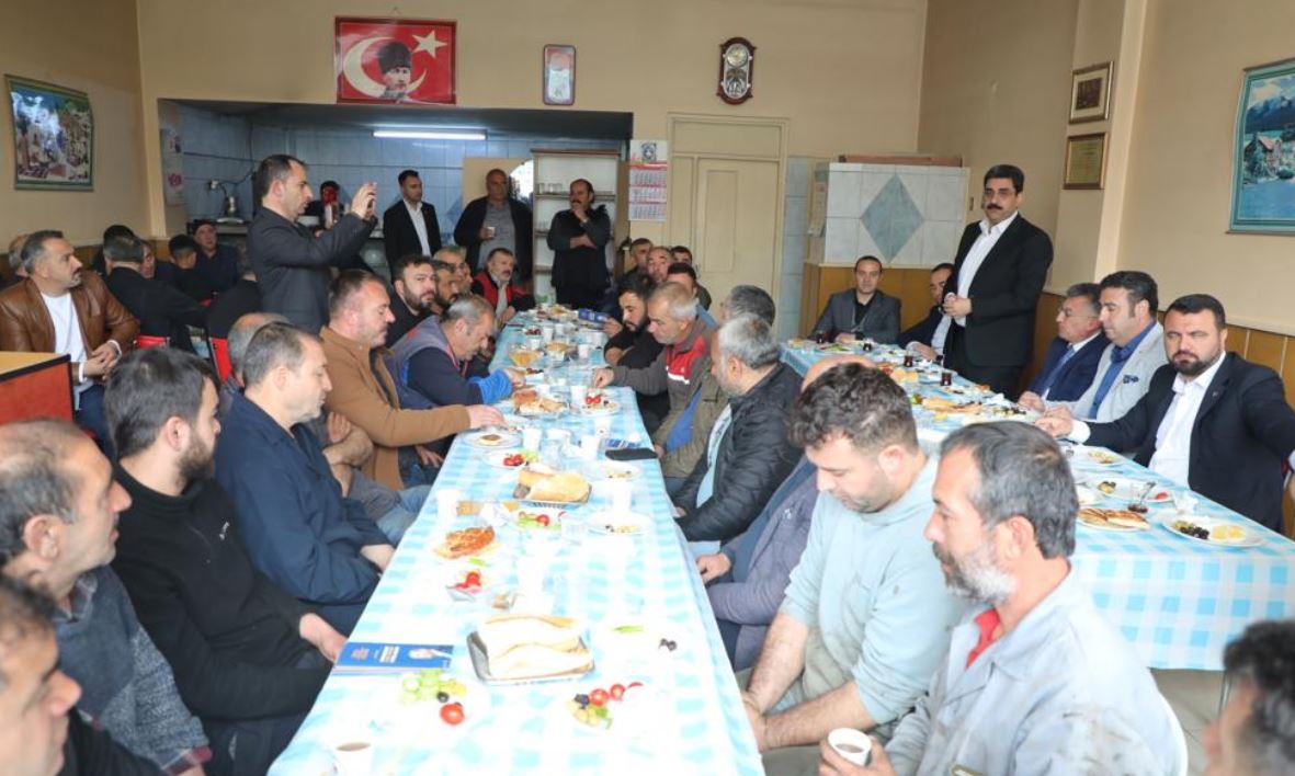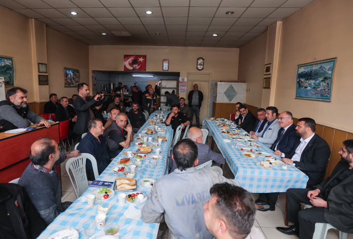 Sanayi esnafları ile birlikte yapılan kahvaltı sonrasında sohbet ortamında toplantı devam ederken, Sivas Belediye Başkanı Hilmi Bilgin'de toplantıya eşlik etti. (ŞEREF GÜLMEZ)