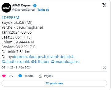 AFAD tarafından yapılan açıklamaya göre, Gümüşhane'nin Kelkit ilçesinde 3.6 büyüklüğünde deprem meydana geldi. Yapılan açıklamada, saat 23.05'te meydana gelen depremin derinliği ise 7.61 km olarak belirtildi.