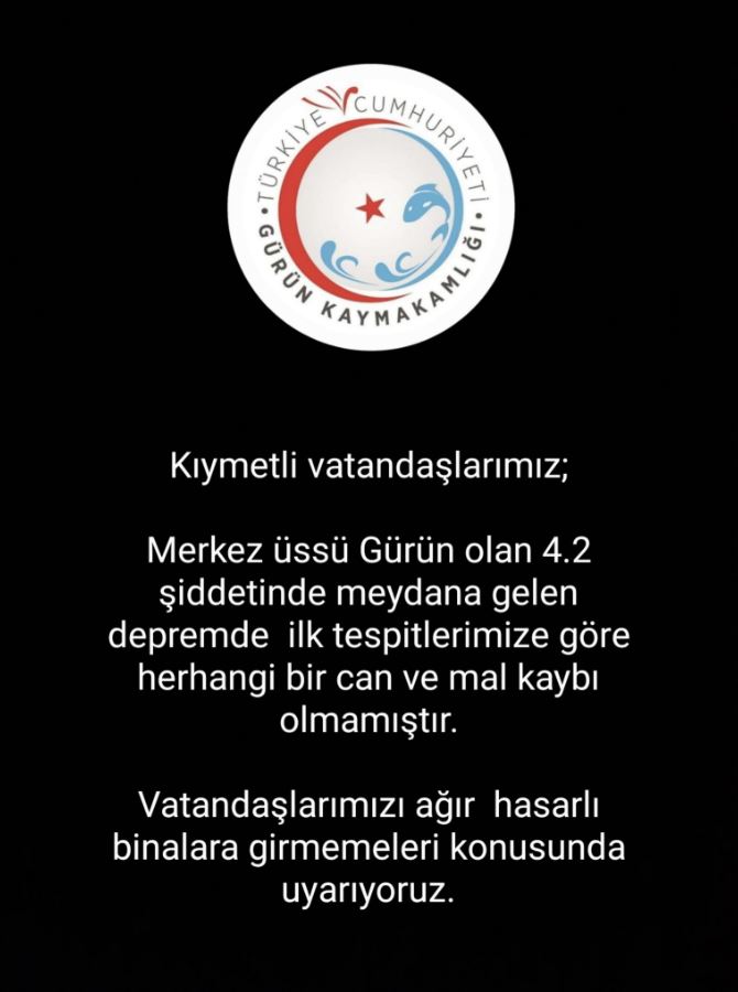 "Kıymetli vatandaşlarımız; Merkez üssü Gürün olan 4.2 şiddetinde meydana gelen depremde ilk tespitlerimize göre herhangi bir can ve mal kaybı olmamıştır. Vatandaşlarımızı ağır hasarlı binalara girmemeleri konusunda uyarıyoruz."
