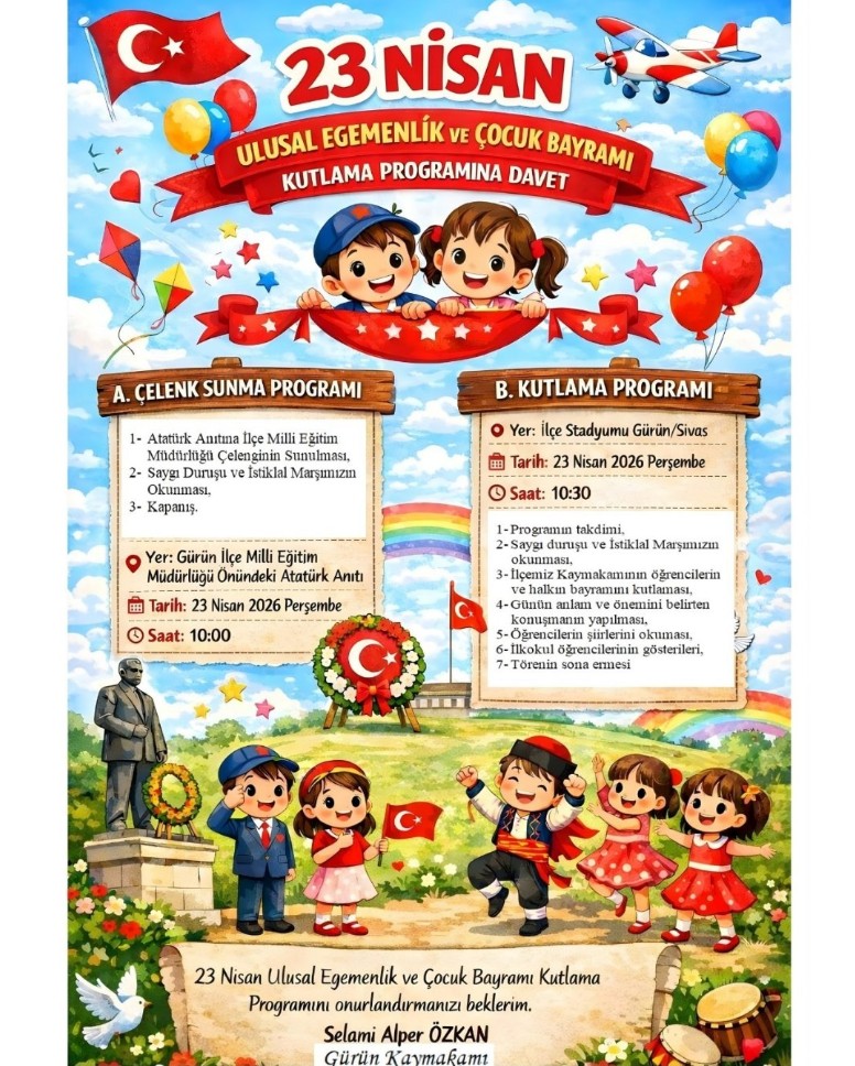 Yapılan duyuruya göre program, 23 Nisan Perşembe günü saat 10.30’da Gürün İlçe Stadyumu’nda gerçekleştirilecek. İlçe genelinde büyük bir katılımın beklendiği etkinlikte, öğrenciler tarafından çeşitli gösteriler sahnelenecek.