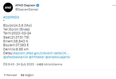 Gürün’de deprem! 3.6!