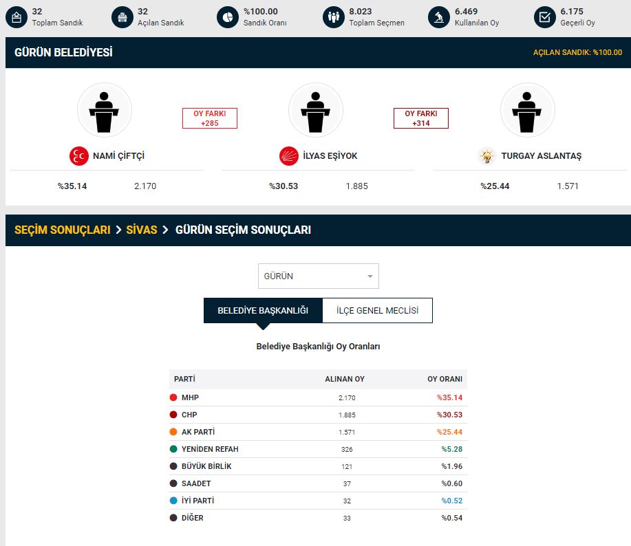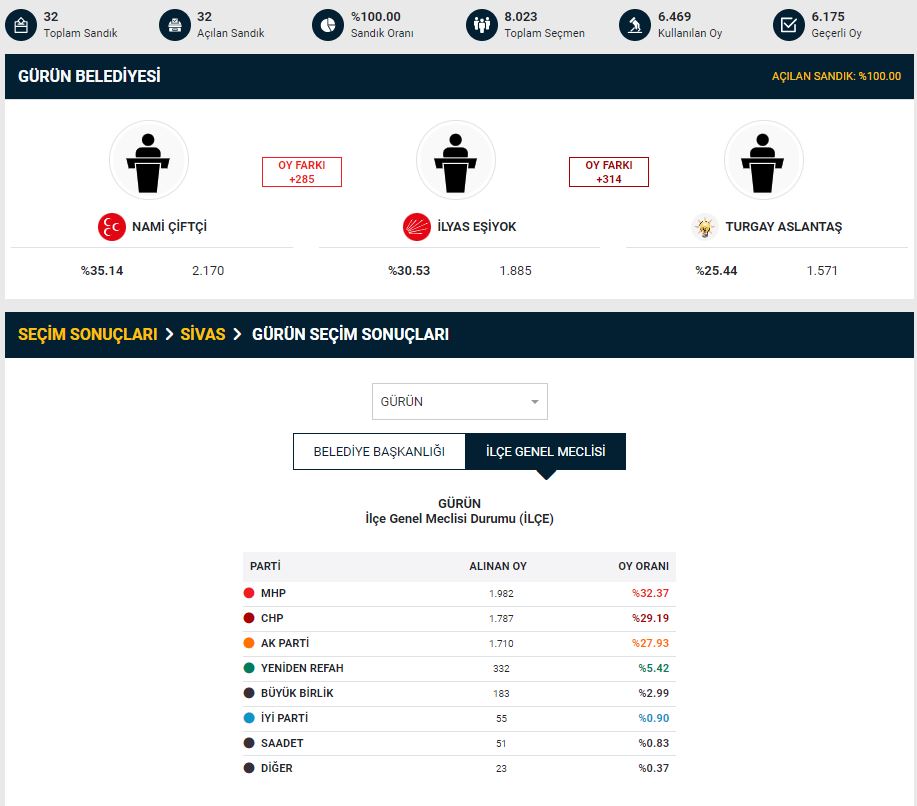 İşte 31 Mart 2024 Yerel Seçimlerinde Gürün İlçesinin Başkanlık seçim sonuçları..