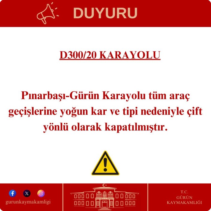 Gürün Kaymakamlığı tarafından yapılan açıklamaya göre, 09 Ocak 2026 tarihi saat 23.30 itibarıyla söz konusu yol tüm araç geçişlerine çift yönlü olarak kapatıldı. Alınan kararın, bölgede etkili olan olumsuz hava şartları ve ulaşım güvenliğiyle ilgili riskler nedeniyle uygulamaya konulduğu belirtildi.