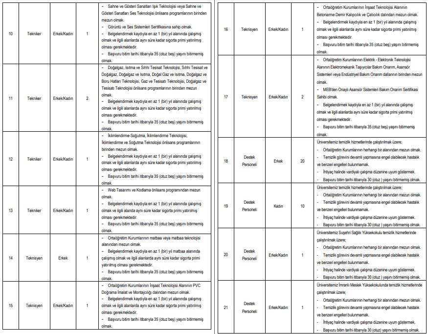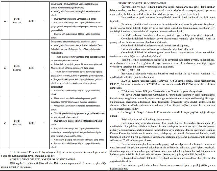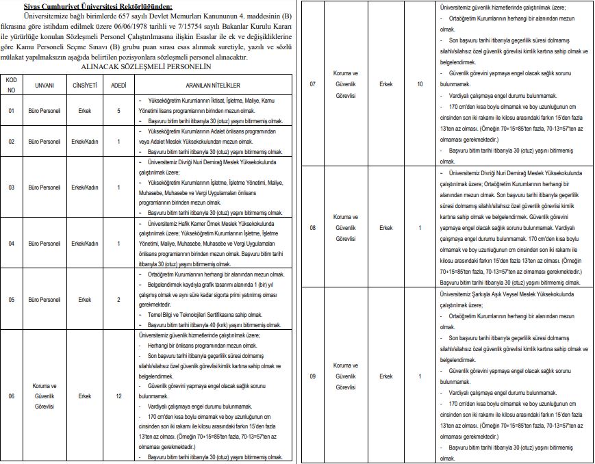 "Üniversitemize bağlı birimlerde 657 sayılı Devlet Memurları Kanununun 4. maddesinin (B) fıkrasına göre istihdam edilmek üzere 06/06/1978 tarihli ve 7/15754 sayılı Bakanlar Kurulu Kararı ile yürürlüğe konulan Sözleşmeli Personel Çalıştırılmasına ilişkin Esaslar ile ek ve değişikliklerine göre Kamu Personeli Seçme Sınavı (B) grubu puan sırası esas alınmak suretiyle, yazılı ve sözlü mülakat yapılmaksızın aşağıda belirtilen pozisyonlara sözleşmeli personel alınacaktır." ifadelerine yer verildi.