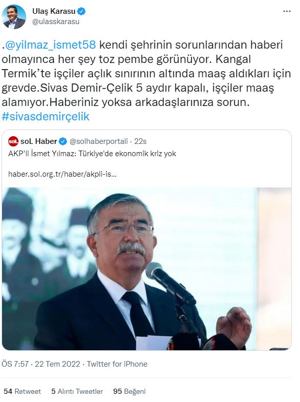 Yayınlanan haberi sosyal medya hesabı twitterdan alıntılayarak Yılmaz için "Sivas'tan haberi olmayınca her şey toz pembe görünüyor" diyen karasu paylaşımında şu ifadelere yer verdi;
