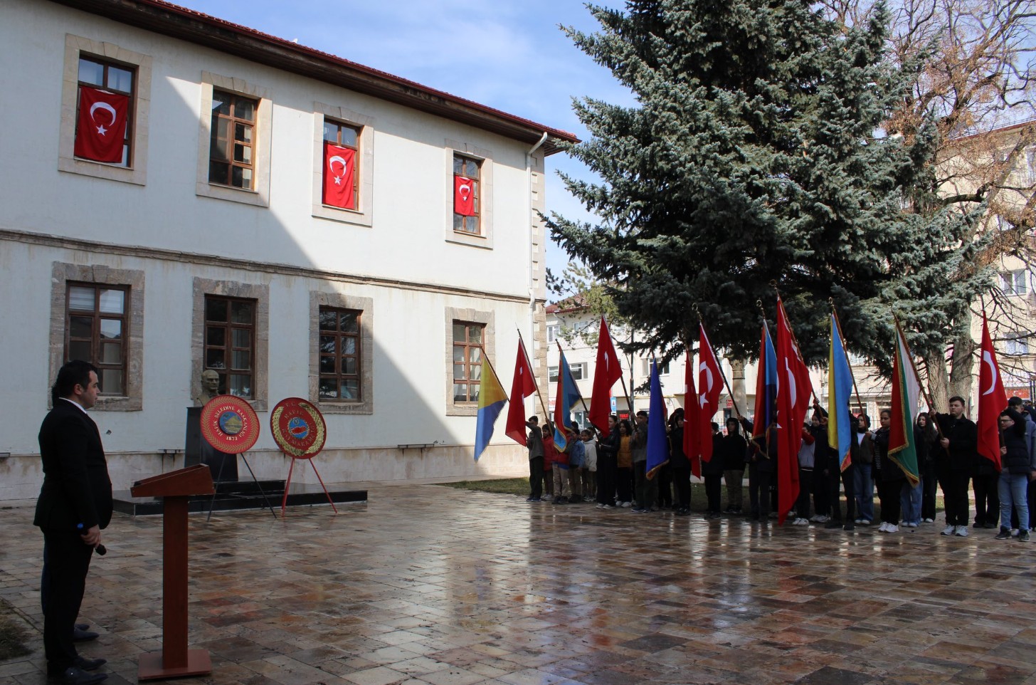 İlçe merkezinde düzenlenen törene Kaymakam Funda Hamza Çaldağı, Belediye Başkanı Habip Görler, kurum amirleri, vatandaşlar ve öğrenciler katıldı. Program, saygı duruşu ve İstiklal Marşı’nın okunmasıyla başladı.