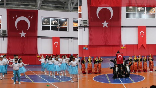 Kapalı Spor Salonu’nda gerçekleştirilen programda öğrenciler tarafından hazırlanan gösteriler sergilenirken, 23 Nisan’ın coşkusu hep birlikte yaşandı.