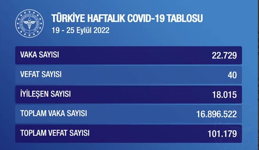 Türkiye'de 19-25 Eylül haftasında 22 bin 729 kişinin corona virüs testi pozitif çıktı, 40 kişi yaşamını yitirdi. Salgının başından bu yana toplam vaka sayısı 16 milyon 896 bin 522, toplam can kaybı ise 101 bin 179 oldu.-internethaber