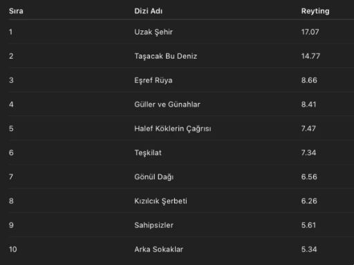 Listenin üçüncü sırasında ise son haftaların yükselişteki yapımı Eşref Rüya yer aldı. Dizi, özellikle dramatik sahneleri ve güçlü oyuncu performanslarıyla sosyal medyada sıkça konuşuldu.