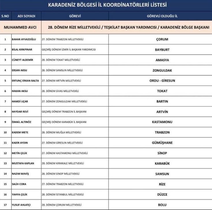 MYK’da alınan kararla Karadeniz Bölgesi il koordinatörleri listesi şu şekilde;