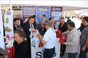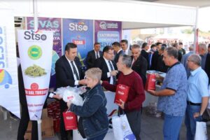 Ankara’nın Etemesgut ilçesindeki etkinlik alanında gerçekleştirilen Sivas günlerinde Esnaf ve Sanatkarlar Odaları Birliği Başkanı Hakan Demirgil, ziyaretçilerle katmer ve çörek, Ticaret ve Sanayi Odası Başkanı Mustafa Eken ise turşu hediye etti.