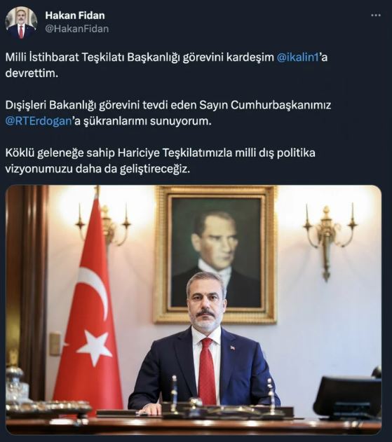 Bakan Fidan paylaşımında: "Milli İstihbarat Teşkilatı Başkanlığı görevini kardeşim İbrahim Kalın'a devrettim.