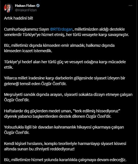 Özgür Özel’in yabancı basına verdiği demeçleri de eleştiren Fidan, sosyal medya platformu X üzerinden yaptığı paylaşımda Özel’e “Artık haddini bil!” çıkışında bulundu.