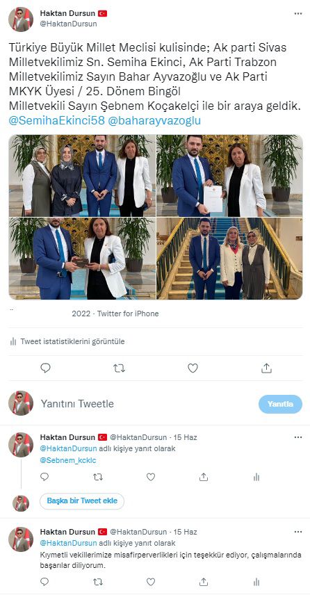 “Haktan Dursun, Ulaştırma ve Altyapı Bakanlığı Bakan Yardımcısı Selim Dursun; AK Parti Sivas Milletvekili Semiha Ekinci, AK Parti Trabzon Milletvekili Bahar Ayvazoğlu ve AK Parti MKYK üyesi Şebnem Koçakelçi’yi ziyaret etti”