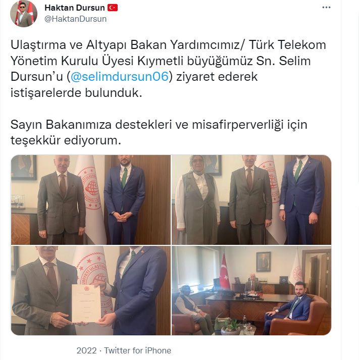 . Ulaştırma ve Altyapı Bakan Yardımcımız/ Türk Telekom Yönetim Kurulu Üyesi Kıymetli büyüğümüz Sn. Selim Dursun’u (@selimdursun06) ziyaret ederek istişarelerde bulunduk.