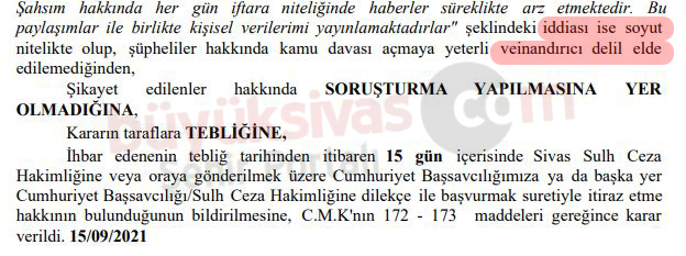 " https://www.buyuksivas.com/halil-sener-banka-asya/ haberi ile adımı soy adımı yazarak olmayan bank aysa hesabı HAREKETLERİ ile haber yaparak iftira etmiştir. Söz konusu haberde Fetö komisyonunda görevli olduğum belirtilerek beni FETÖ/PDY terör örgütüne hedef göstermişler ve can güvenliğimi tehlikeye atmışlardır. Bu haberlerden dolaylı Fetö/Pdy terör örgütünün dolaylı propagandası yapılmaktadır. Şahsım hakkında her gün iftara niteliğinde haberler süreklikte arz etmektedir. Bu paylaşımlar ile birlikte kişisel verilerimi yayınlamaktadırlar" şeklinde Büyük Sivas Medya Grubu Yazı İşleri Müdürümüz Cemil Duymaz aleyhinde şikayetçi olan Halil Şener'e bir yargı tokadı daha...