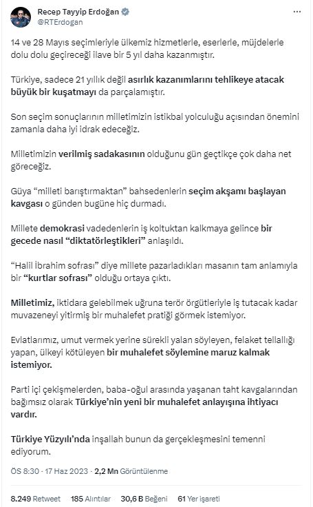 Erdoğan paylaşımında: "14 ve 28 Mayıs seçimleriyle ülkemiz hizmetlerle, eserlerle, müjdelerle dolu dolu geçireceği ilave bir 5 yıl daha kazanmıştır.