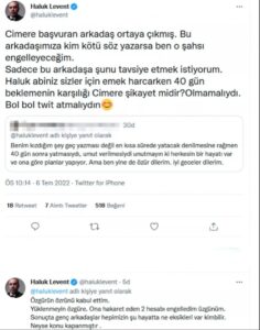 Levent ise o tweeti paylaşarak "Cimer'e başvuran arkadaş ortaya çıkmış. Bu arkadaşımıza kim kötü söz yazarsa ben o şahsı engelleyeceğim. Sadece bu arkadaşa şunu tavsiye etmek istiyorum. Haluk ağabeyiniz sizler için emek harcarken 40 gün beklemenin karşılığı Cimer'e şikayet midir? Olmamalıydı. Bol bol twit atmalıydın. Özrünü kabul ettim. Yüklenmeyin Özgür'e, ona hakaret eden 2 hesabı engelledim üzgünüm. Sonuçta genç arkadaşlar hepimizin şu hayatta ne eksikleri var kim bilir. Neyse konu kapanmıştır" paylaşımını yaptı. ensonhaber