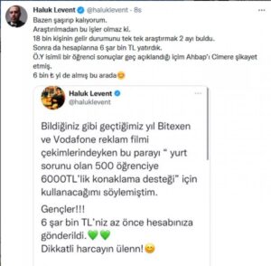 Twitter'dan paylaşım yapan Haluk Levent, "Bazen şaşırıp kalıyorum. Araştırılmadan bu işler olmaz ki. 18 bin kişinin gelir durumunu tek tek araştırmak 2 ayı buldu. Sonra da hesaplarına 6'şar bin TL yatırdık. Ö.Y isimli bir öğrenci sonuçlar geç açıklandığı içim Ahbap’ı Cimer'e şikayet etmiş. 6 bin TL'yi de almış bu arada" dedi.