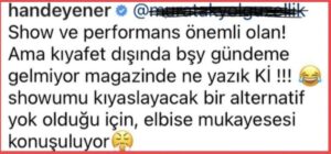 Yorumuna devam eden şarkıcı, “Şov ve performans önemli olan. Ama kıyafet dışında bir şey gündeme gelmiyor magazinde ne yazık ki! Şovumu kıyaslayacak bir alternatif yok olduğu için elbise mukayesesi konuşuluyor.” diye yazdı.
