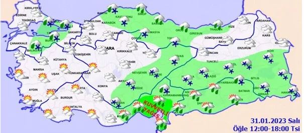 Yağışların; Orta ve Doğu Karadeniz kıyıları, Güneydoğu Anadolu'nun güneyi ile Akdeniz kıyılarında yağmur ve sağanak, yağış alan diğer yerlerde karla karışık yağmur ve kar şeklinde olması bekleniyor. Yağışların bu akşam saatlerinde Muş ve Bitlis, Salı Adana, Osmaniye ve Hatay çevrelerinde kuvvetli olması bekleniyor.