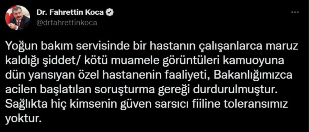 "Yoğun bakım servisinde bir hastanın çalışanlarca maruz kaldığı şiddet/ kötü muamele görüntüleri kamuoyuna dün yansıyan özel hastanenin faaliyeti, Bakanlığımızca acilen başlatılan soruşturma gereği durdurulmuştur. Sağlıkta hiç kimsenin güven sarsıcı fiiline toleransımız yoktur."