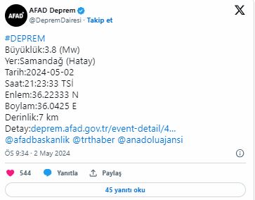AFAD'dan yapılan açıklamaya göre, Hatay'ın Samandağ ilçesinde 3.8 şiddetinde bir deprem meydana geldi.