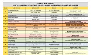 Açıklanan listeye göre, Sivas merkezde ve çeşitli mahallelerde görev yapacak olan imam, müezzin, öğretim üyeleri ve hafızlar, belirlenen camilerde hatimle teravih namazlarını kıldıracak.