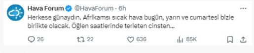 Meteoroloji kaynağı Hava Forum, X hesabı üzerinden yaptığı paylaşımla 3 gün boyunca sıcak havaların etkili olacağını duyurdu.