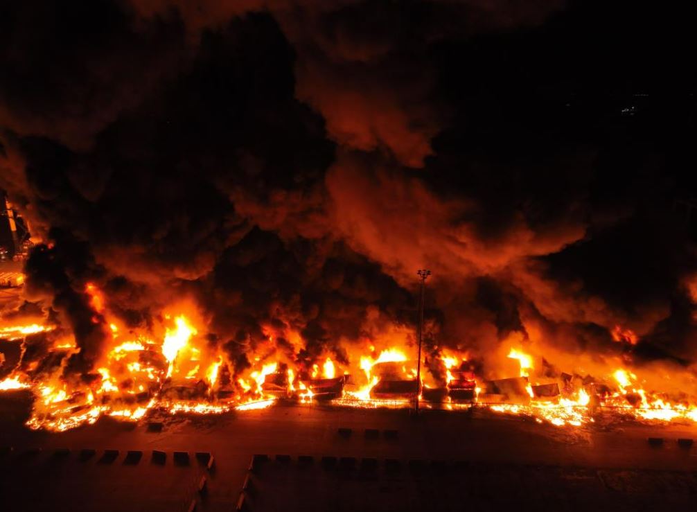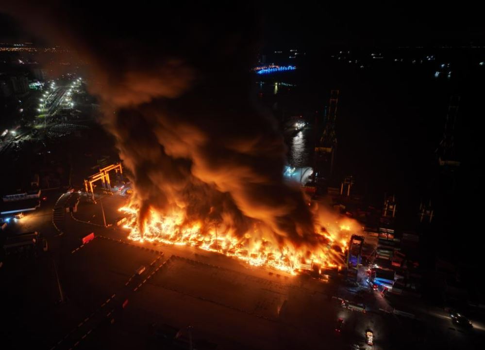 Dün Kahramanmaraş merkezli depremlerin ardından İskenderun Limanı'nda konteynerlerin devrilmesi sonucu yangın çıkmıştı. Kontrol altına alınamayan yangına, yangın söndürme helikopteri ile müdahale ediliyor. İHA ekipleri havanın kararmasına rağmen yangının devam ettiği bölgedeki yangını gökyüzünden denetledi.-iha