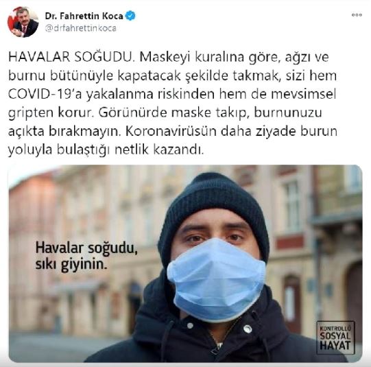 Fahrettin Koca resmi Twitter hesabından yaptığı paylaşımda, “Havalarsoğudu. Maskeyi kuralına göre, ağzı ve burnu bütünüyle kapatacak şekilde takmak, sizi hem Covid-19’a yakalanma riskinden hem de mevsimsel gripten korur. Görünürde maske takıp, burnunuzu açıkta bırakmayın. Korona virüsün daha ziyade burun yoluyla bulaştığı netlik kazandı” ifadelerini kullandı.