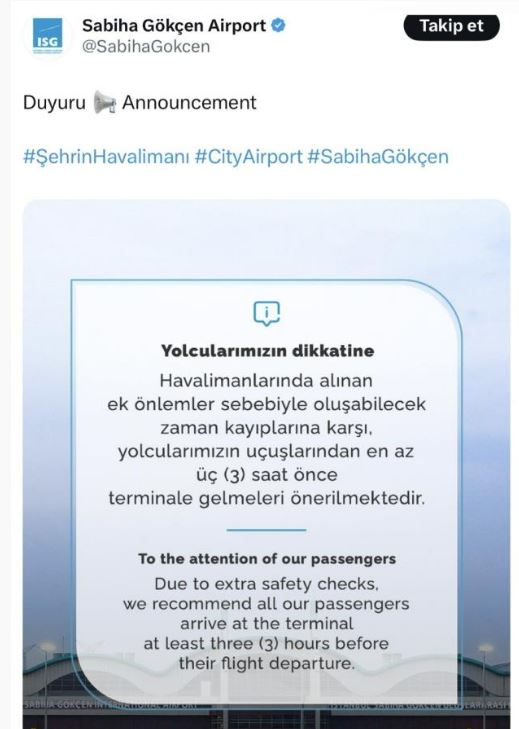 Güvenlik önlemlerinin artırılmasına ilişkin olarak Sabiha Gökçen Havalimanı'ndan yapılan açıklamada, “Yolcularımızın dikkatine, Havalimanlarında alınan ek önlemler sebebiyle oluşabilecek zaman kayıplarına karşı, yolcularımızın uçuşlarından en az üç (3) saat önce terminale gelmeleri önerilmektedir” denildi. (İHA)