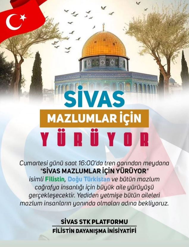 Sivas STK Platformu "Sivas Mazlumlar İçin Yürüyor" organizasyonuyla yarın Tren Garından başlatacağı yürüyüşü, Hükümet Meydanında sona erdirecek..