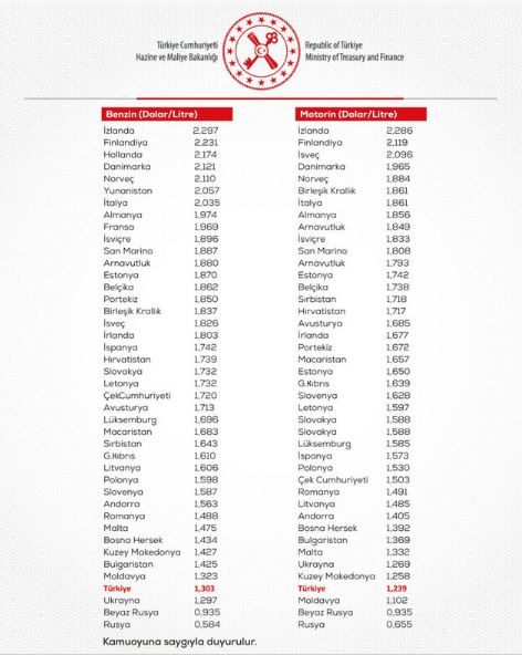 Yapılan artışa rağmen Ülkemiz halen benzinde de motorinde de Avrupa'da en ucuz 4. ülke konumundadır.