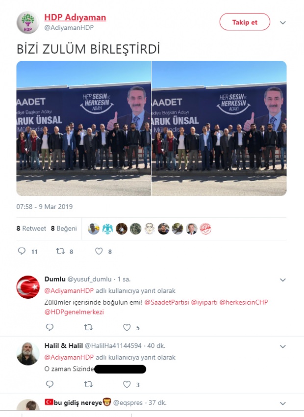 HDP'nin Adıyaman Twitter hesabı "bizi zulüm birleştirdi" mesajıyla Saadet Partisi'yle yapılan ittifakı iyice gün yüzüne çıkardı.