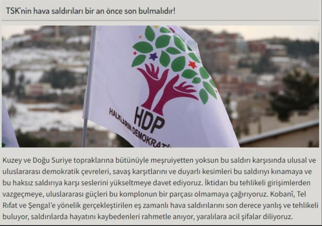 HDP'nin "TSK’nın hava saldırıları bir an önce son bulmalıdır" başlıklı açıklamasında, harekatın "meşruiyetten yoksun" olduğu şeklinde asılsız iddialar öne sürüldü.