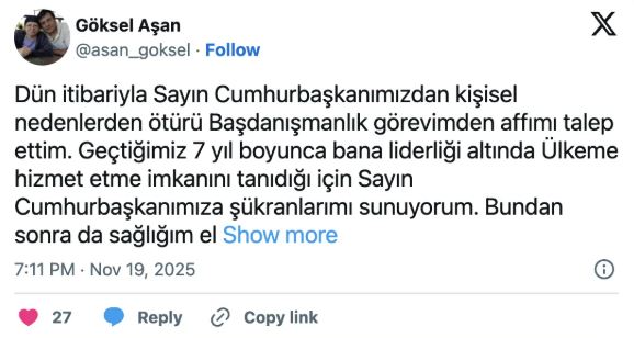 Beştepe’de dikkat çeken bir ayrılık yaşandı. Cumhurbaşkanı Başdanışmanı Göksel Aşan, yaklaşık 7 aydır sürdürdüğü görevinden istifa ettiğini duyurdu.