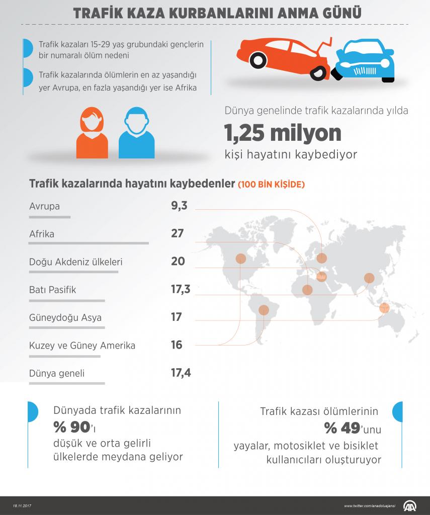 Dünya genelinde trafik kazalarında her yıl yaklaşık 1,25 milyon kişi hayatını kaybediyor ve milyonlarca kişi yaralanıyor. AA muhabirinin Dünya Sağlık Örgütü (WHO) verilerinden derlediği bilgilere göre, trafik kazaları milyonlarca kişinin ciddi şekilde yaralanmasına ya da uzun süreli sağlık problemleri yaşamalarına yol açıyor. (AA)