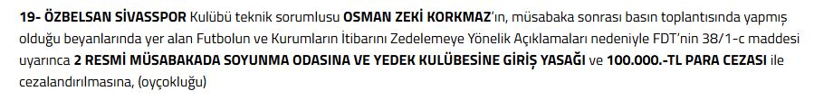 Osman Zeki Korkmaz’ın istifa etmediği, geçtiğimiz haftalarda Profesyonel Futbol Disiplin Kurulu (PFDK) tarafından 2 maç men cezası aldığı, bu nedenle basın toplantısına katılamadığı öğrenildi.