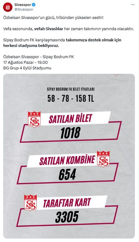 Yarın oynanacak Bodrumspor maçında bütün taraftar kart sahipleri tribüne gelse dahi sayının oldukça düşük kalacağı ifade edildi. Yönetim, Sivas halkını Sivasspor’a sahip çıkmaya çağırdı.