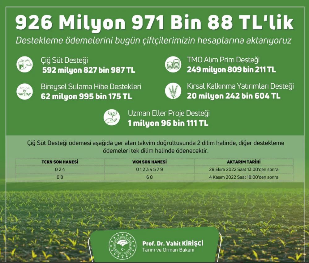 Tarım ve Orman Bakanı Vahit Kirişci, 926 milyon 971 bin 88 liralık tarımsal destekleme ödemelerinin bugün çiftçilerin hesaplarına yatırılacağını açıkladı. Ayrıca Sosyal medya hesabından tarımsal destekleme ödemelerine ilişkin açıklama yapan Tarım ve Orman Bakanı Vahit Kirişci, 926 milyon 971 bin 88 liralık tarımsal destekleme ödemelerinin bugün çiftçilerin hesaplarına aktarılacağını bildirdi.