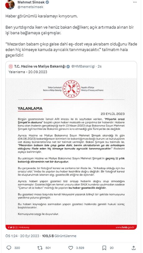 Bakan Şimşek yaptığı açıklamada: " Haber görünümlü karalamayı kınıyorum. Ben yurtdışında iken ve henüz bakan değilken; açık artırmada alınan bir işi bana bağlamaya çalışmışlar. 'Mezardan babam çıkıp gelse dahi eş-dost veya akrabam olduğunu ifade eden hiç kimseye kamuda ayrıcalık tanınmayacaktır.' talimatım hala geçerlidir!" ifadelerine yer verdi. (Haber Merkezi)