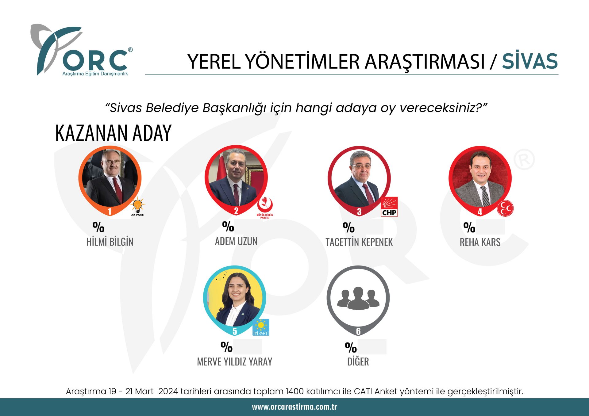 Araştırma ORC'nin sosyal medya hesabından "- Sivas ilinde yaşayan seçmenlere, "Belediye Başkanlığı için hangi adaya oy vereceksiniz?" sorusu yöneltilmiştir." açıklaması ile duyurulurken kalan 1 haftalık sürede diğer adayların farkı kapatması mümkün görünmüyor.
