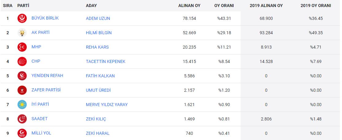 MHP Belediye Başkan adayı Reha Kars'a 20.235 oy verilirken, MHP'nin Belediye Meclis Üyeliği listesine 22.264 oy verildi. MHP'ye oy veren yaklaşık 2000 seçmen partisinin belediye meclis listesine oy verirken başkan adayına oy vermedi. YANİ BBP, 2000 OYU MHP'DEN ALDI...