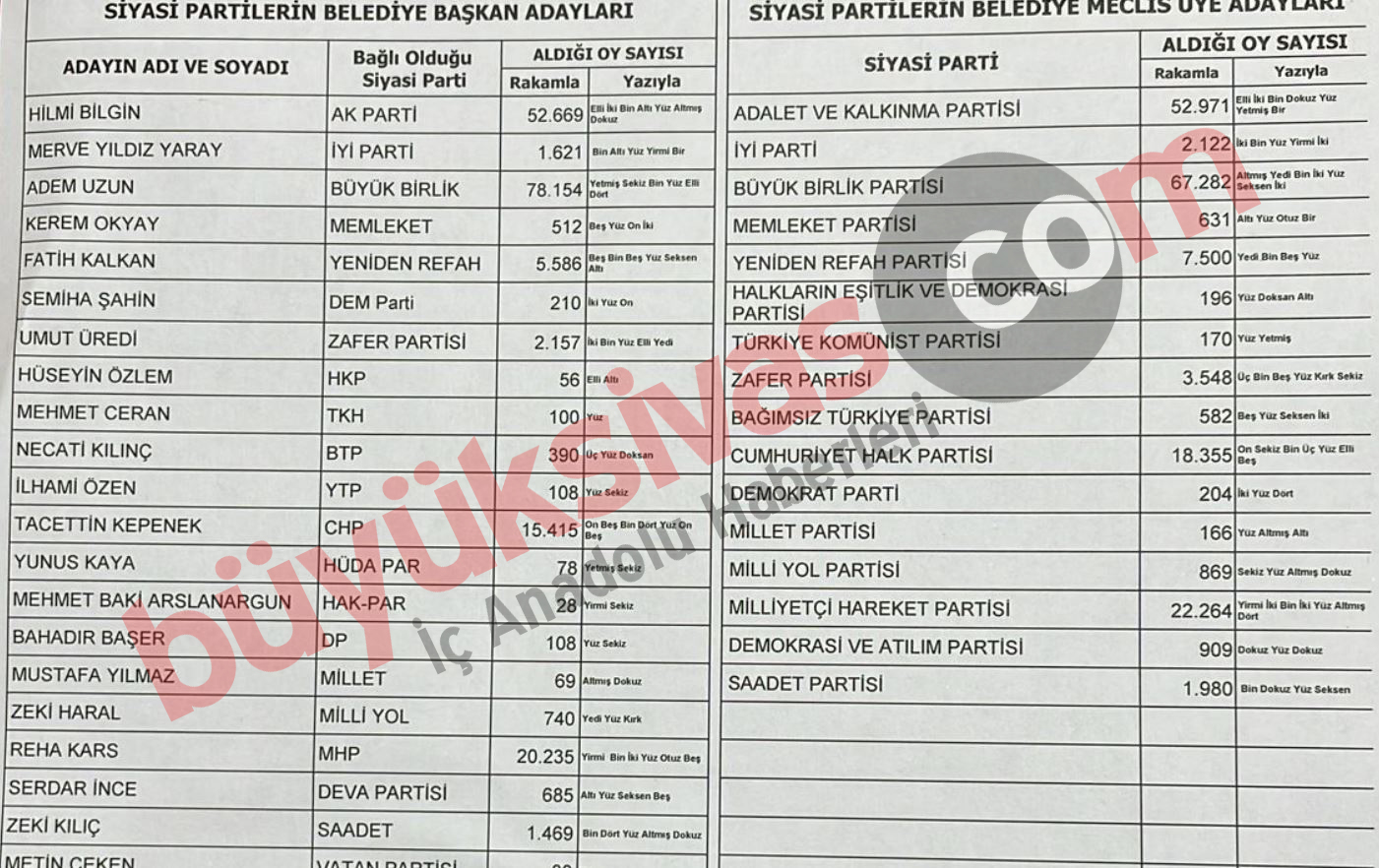 AK Parti Belediye Başkan adayı Hilmi Bilgin'e 52.669 oy verilirken, AK Parti'nin Belediye Meclis Üyeliği listesine 52.971 oy verildi. AK Parti'ye oy veren yaklaşık 300 seçmen partisinin belediye meclis listesine oy verirken başkan adayına oy vermedi. YANİ BBP, 300 OYU AK PARTİ'DEN ALDI...