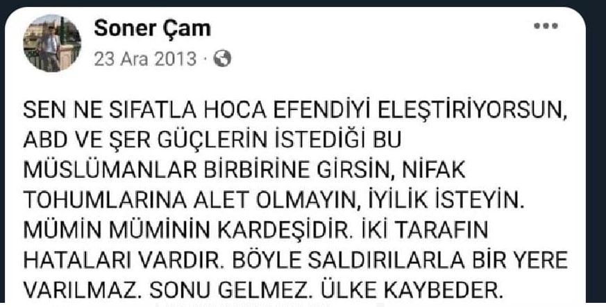 Zafer Partisi Sivas İl Başkanı Hüseyin Düzgün, FETÖ elebaşı Fethullah Gülen ile ilgili yaptığı paylaşımın ortaya çıkması sonrası hakkında disiplin soruşturması başlatılan ve partiden ihraç edilen Soner Çam hakkında açıklamalarda bulundu.
