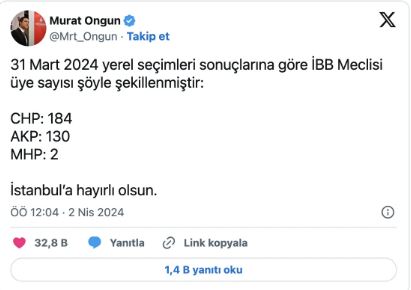 “31 Mart 2024 yerel seçimleri sonuçlarına göre İBB Meclisi üye sayısı şöyle şekillenmiştir: CHP: 184 AKP: 130 MHP: 2 İstanbul’a hayırlı olsun.”