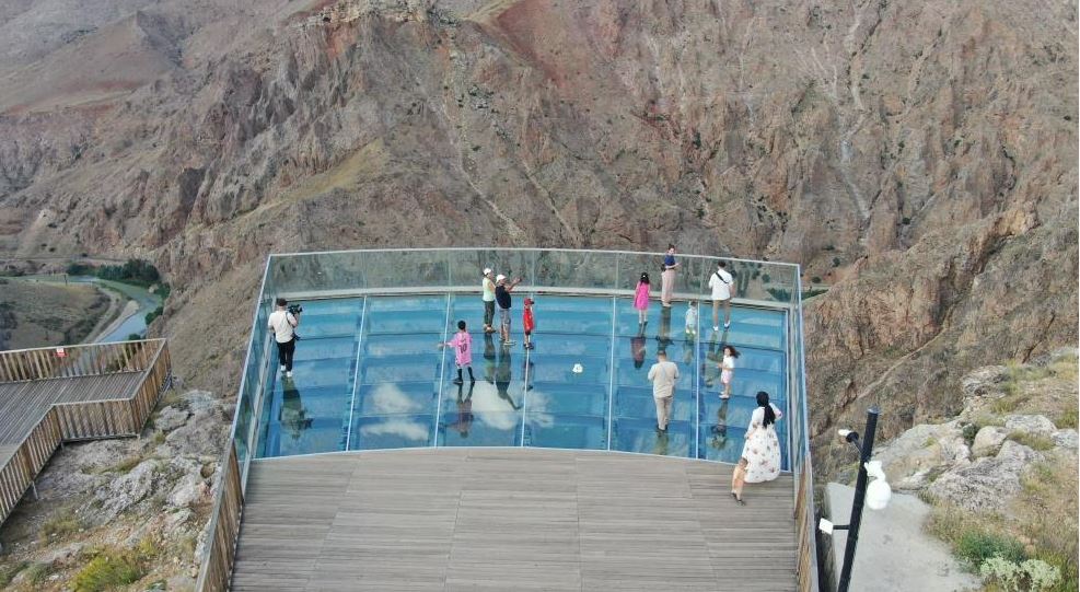 Sivas'ın Divriği ilçesinde bulunan cam seyir terası 243 metre yüksekliğiyle İç Anadolu Bölgesi'nin en yüksek cam seyir terası olma unvanını taşıyor. Açıldığı günden bugüne binlerce vatandaşı ağırlayan cam seyir terası, vatandaşlara adrenalin dolu anlar yaşatıyor. Çaltı çayına bakan manzarası ile eşsiz görüntüler sunan Divriği Cam Seyir Terası, doğa ve tarih tutkunlarının akınına uğruyor. Yaz aylarının gelmesiyle birlikte ziyaretçi sayısının arttığı terasta, vatandaşlar hem anın tadını çıkarıyor, hem de o anları cep telefonu kameraları ile kaydediyor.