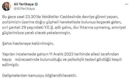"Bu gece saat 23.30’da Vekâletler Caddesinde devriye görevi yapan, polisimizin üzerine doğru şüpheli hareketlede bulunup koşarak gelen, sırt çantalı 29 yaşındaki Y.E.Ş. adlı şahıs, dur ihtarına uymamış, emniyet güçlerimizce yaralı olarak yakalanmıştır. Şahıs hasteneye kaldırılmıştır.